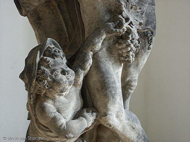 Um diese Frage beantworten zu können, wechseln wir die Perspektive und zoomen ein wenig aus. Nicht uninteressant ist, wo die Trauben hängen, denn wir erkennen, dass Freund Putto an einem Bein lehnt und sich da an irgendwas festklammert. Aber was ist das, wo der Zeigefinger steckt?