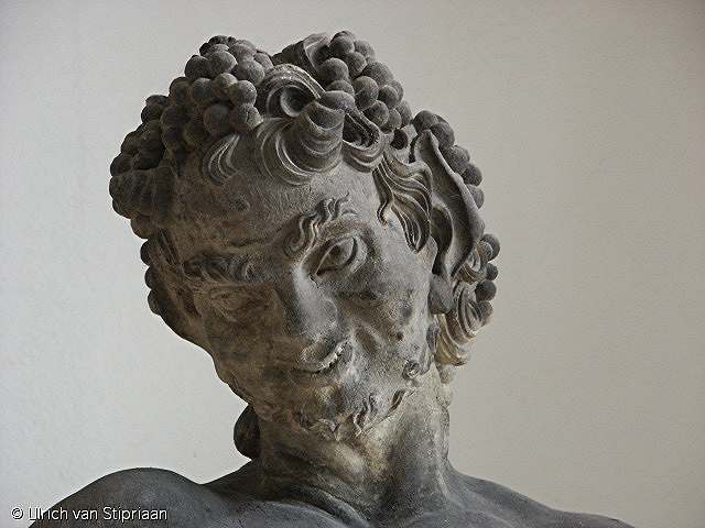 Wir stellen die Beantwortung der Frage ein wenig zurück und sehen einfach mal hoch. Oh: Da sehen wir ja das Gesicht zum Bein! Interessanter Typ, mit Trauben auf dem Kopf und einem Hörnchen...