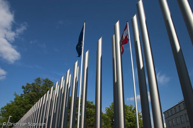 Wir also am Nachmittag mit fachkundiger Begleitung (Danke, Jörg!) durchs Museums- und Regierungsviertel gelaufen. Mund offen hier, Mund offen da. Der neue Trend, bei nahezu allen Botschaften zu beobachten: Zäune, die im Vorbeifahren undurchsichtig und beim Davorstehen licht sind. Das funktioniert ganz einfach, indem einfach Pfähle, Stelen, Wasauchimmer auf Lücke nebeneinander gestellt werden. Einfach, aber wirkungsvoll. Bei der österreichischen Botschaft habe ich es fotografiert, weil die das schönste Klingelschild von allen hatten: Fünf Klingeln, von oben nach unten „Botschaft“, „Kulturforum“, „Handelsabteilung“, „Verteidigungsattaché“, „Portier“. Nette Auswahl!