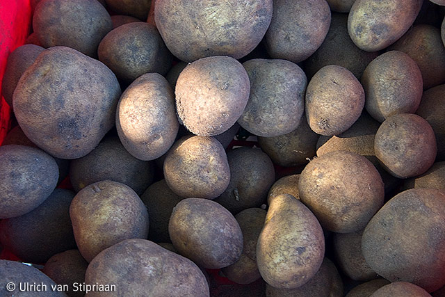 Die ist mehlig-kochend, was nicht in ist – aber zu Kartoffelpü oder zu Kartoffelpuffer lassen die sich gut zermantschen – und wenn man 1. beim Kochen aufpasst („keine Minute zu lang!“ sagt der Schwiegervater, der Adretta im Garten hat) und 2. nicht zu viel Wasser beim Kochen in den Topf gibt („mehr dämpfen als kochen!“ sagt der Verkäufer auf dem Fest in Burg), dann gibt die Adretta die beste Kartoffel für Gerichte mit Sauce ab. Also ein Fall für Gulasch, Rouladen, Braten!