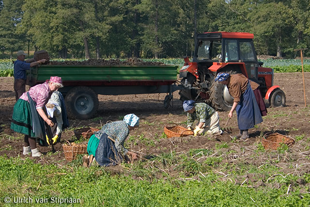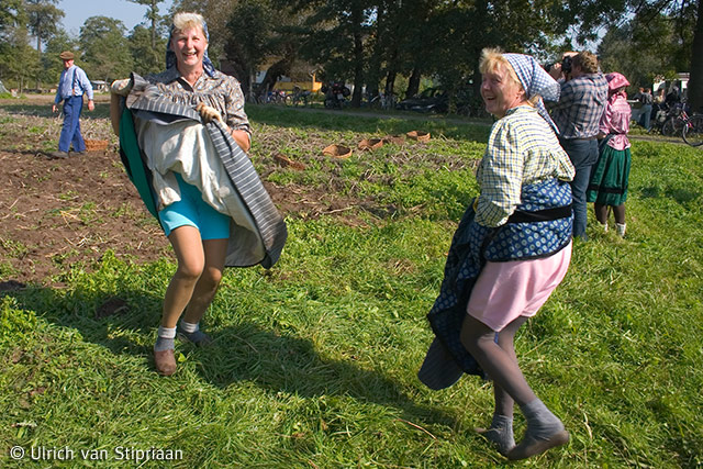 Das im vorigen Beitrag abgelieferte Spreewald-Bild könnte den Eindruck hinterlassen, dass man sich da auf dem Acker dem Alkohol hingibt. Das stimmt, aber – es wurde auch gegessen! getanzt! und geackert: Wie früher, in mühsamer Handarbeit, haben die Mitglieder des Heimat- und Trachtenvereins Burg e. V. sich „in Arbeitstracht mit Korb und Kartoffelhacke zum traditionellen Kartoffelhacken“ (wie es im offiziellen Pressetext heißt) eingefunden. Ein schönes Bild, und glaubt’s mir: Solche Kartoffeln schmecken besser, zumal die Bauern im Spreewald auch noch Adretta anpflanzen.