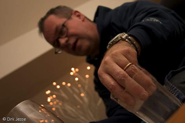 [Update] Dirk hat meine Kamera geholt und das Loch im Arm mit den verursachenden Kerzen sowie die im Eiswasser Erholung suchenden linken Finger dokumentiert. Bei der Medizin am Rande des Bildes handelt es sich um ein in mittleren Dosen einzunehmendes Heilmitel namens „Almara“ (Seleccion 2002, Bodegas Macaya. Navarra, 100% Tempranillo) – wirkt gut 🙂