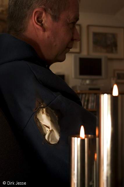So gut das auch aussah – Feuer muss gelöscht werden, und beherzt schlug ich mit der linken Hand die Flamme aus. Das lokal begrenzte Feuer wurde mit drei gezielten Schlägen gelöscht. Der Schaden begrenzt sich auf ein Loch im Hoodie und verbrannte linke Fingerkuppen, die gerade in Eisweinwasser gekühlt werden.